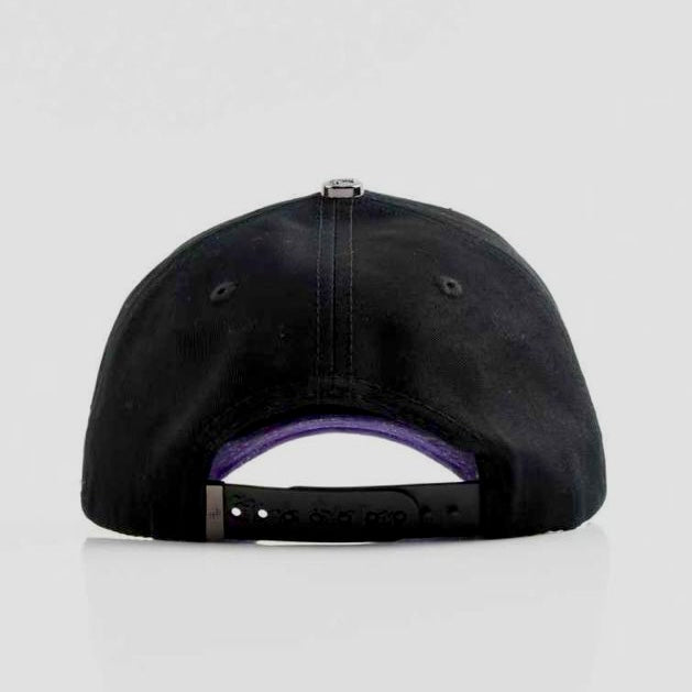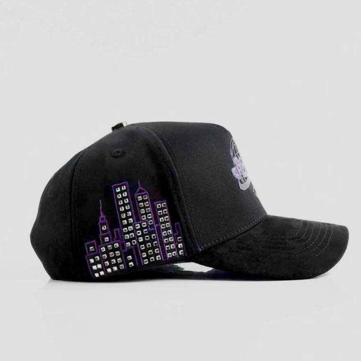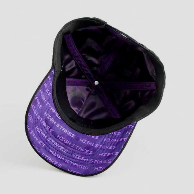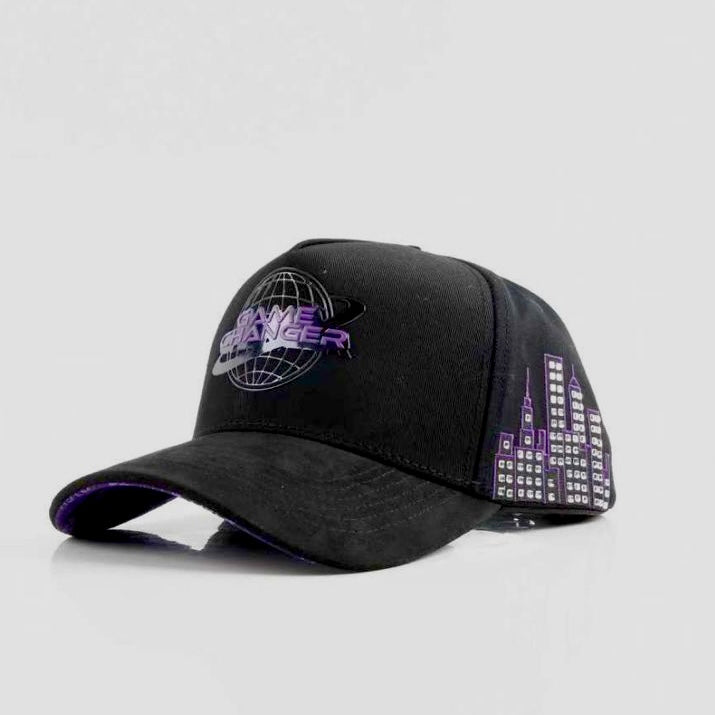 La “Arcade” es de nuestros conceptos favoritos, siguiendo una idea retrofuturista y con la estética de los videojuegos arcade con los que todos crecimos. Para nosotros esta gorra es el premio que obtienes después de vencer al boss final o el ítem con el que vistes a tu personaje que no cualquiera puede desbloquear. Está hecha con algodón negro y en el frente se lee “Game Changer” con un logo que sigue el estilo retrofuturista hecho con TPU brillante. En los laterales tiene edificios donde cada ventana es pedrería brillante en plateado lo que hace que la gorra resalte y brille. La paleta de colores es negro con morado que nos recuerda a nuestro famoso modelo “Bipolar” que tanto nos piden pero que ya no volverá (lo más parecido que tendrán es la Arcade, aprovechen). La visera es de gamuza negra por arriba y gamuza morada por abajo con un patrón que dice “High Stakes” en tipografía de videojuego. Sube el nivel de tu skin con la Arcade.